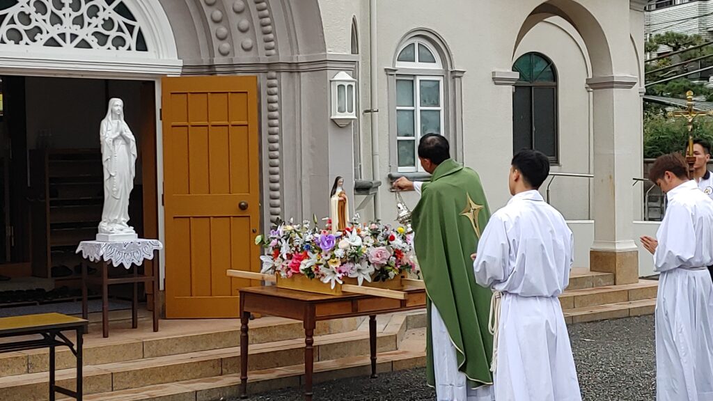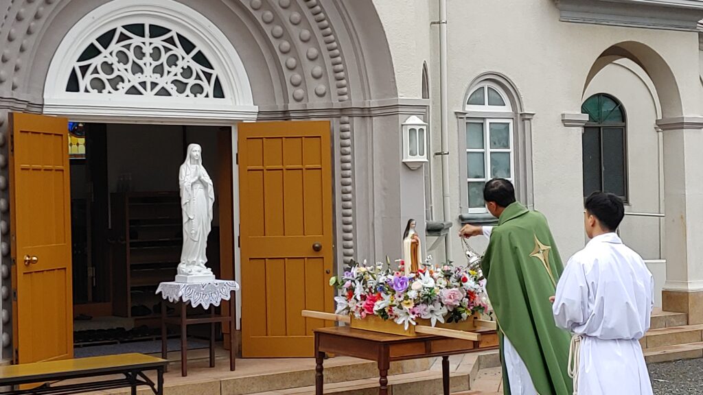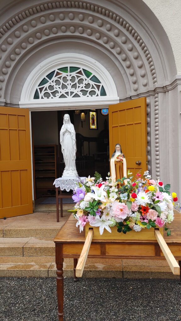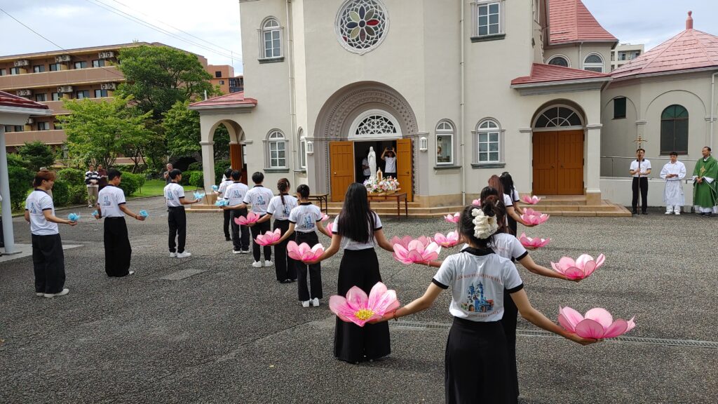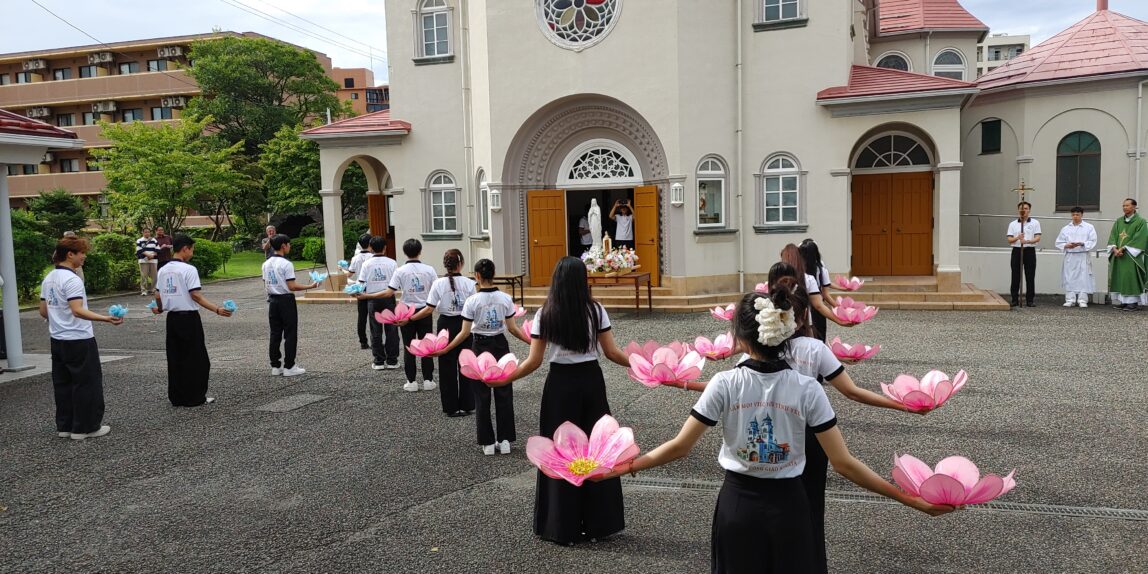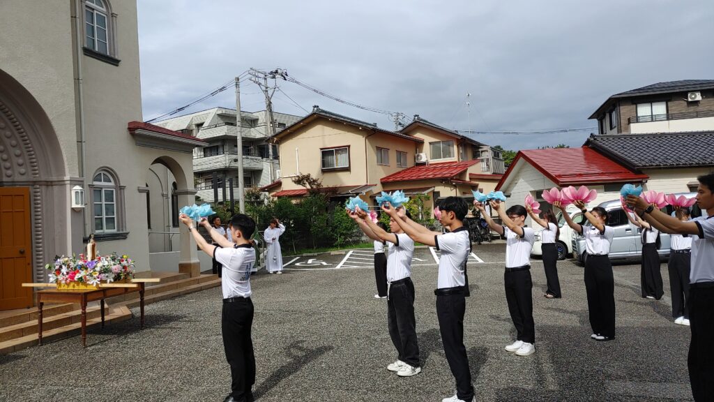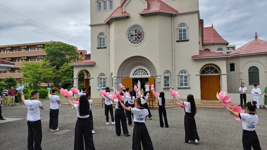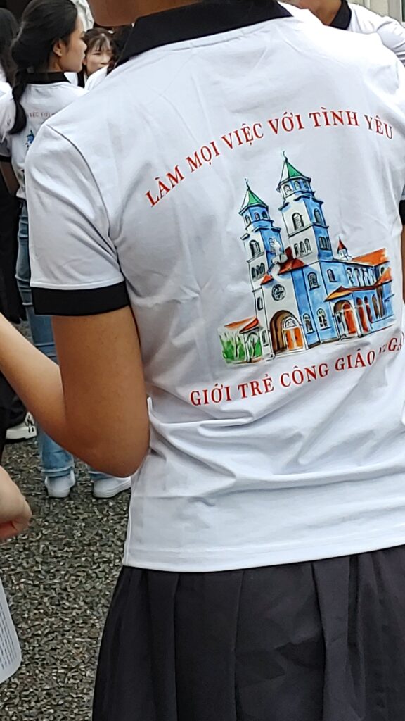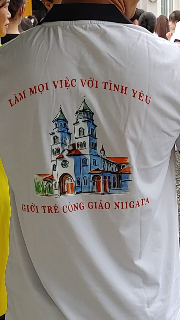 【教会日記】2025年10月5日 守護聖人のお祝い 新潟教区のベトナム青年会の守護聖人(幼いイエスの)聖テレジアのお祝いが今年も行われた。 揃いのポロシャツの背中にはベトナム語で「すべてのことに愛で献身」(上)「カトリック新潟教区の青年会」(下)の文字。