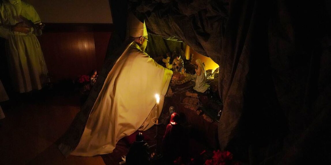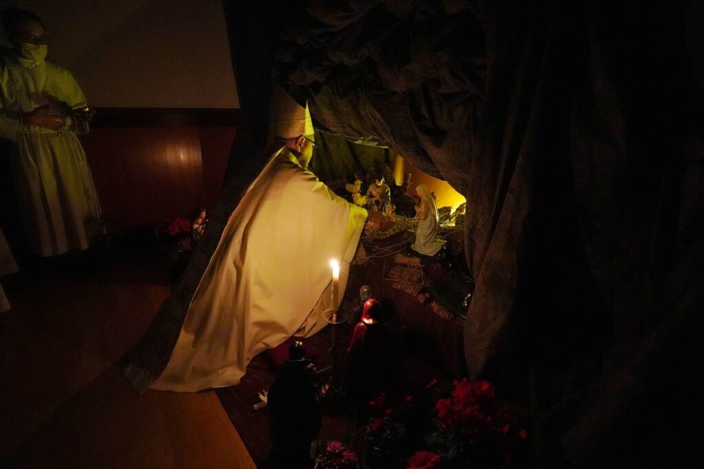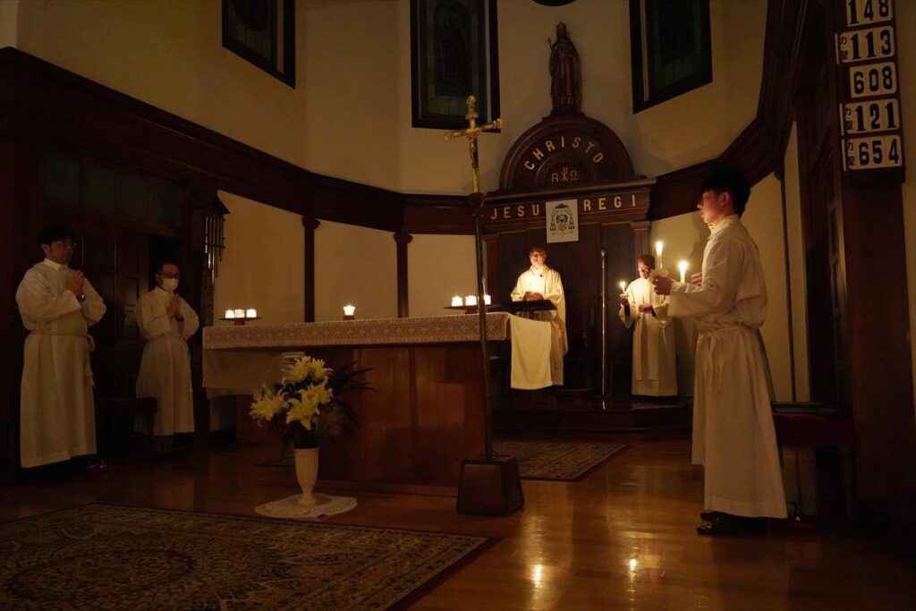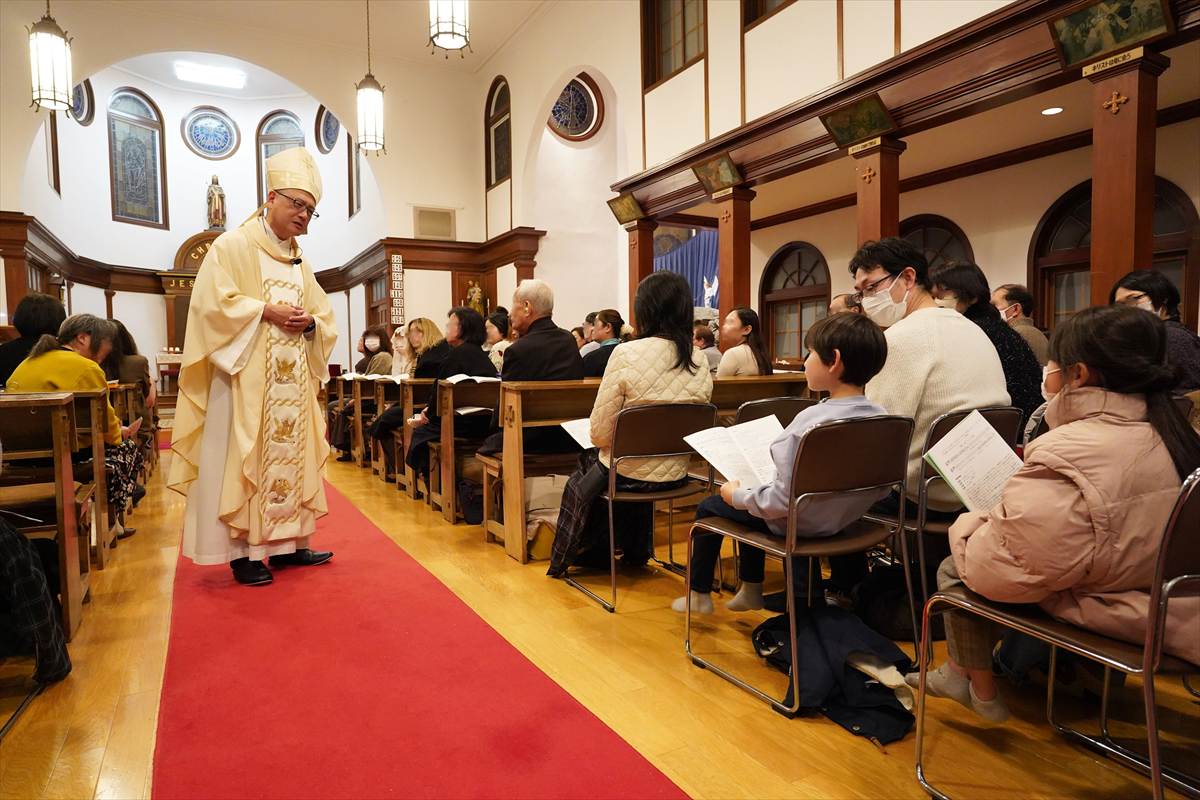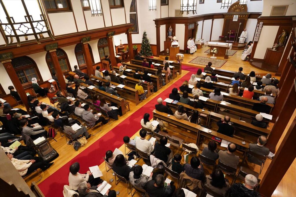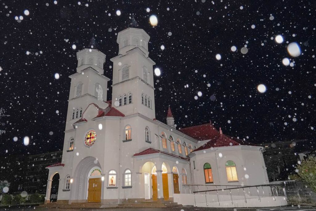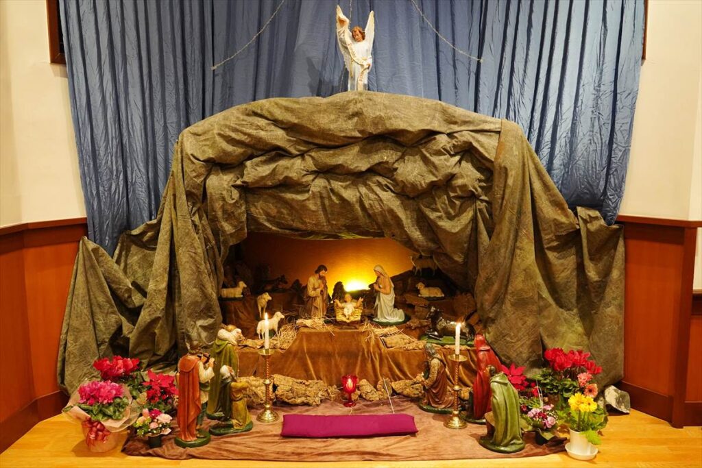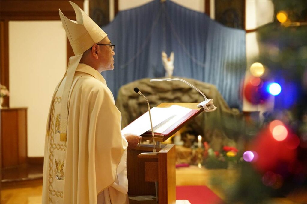 【教会日記】2025年12月24日 主の降誕夜半ミサ 主の降誕の夜半ミサが、夜8時から成井司教の司式で行われた。氷雨ながら、この日ばかりはと足を運んだ参列者で、聖堂は満員であった。司祭の入場後、司教の手で幼子イエスが飼い葉桶に置かれると、馬小屋に光が灯った。その後、キャンドルサービスが行われ、司教の促しで各自がロウソクのあかりを沈黙のうちにしばらく眺めた。 静かな祈りの中でミサが行われ、終了して外に出ると、雨が上がっていた。センター1Fの研究室には温かな飲み物が用意され、帰路に就く人々の寒さを和らげた。