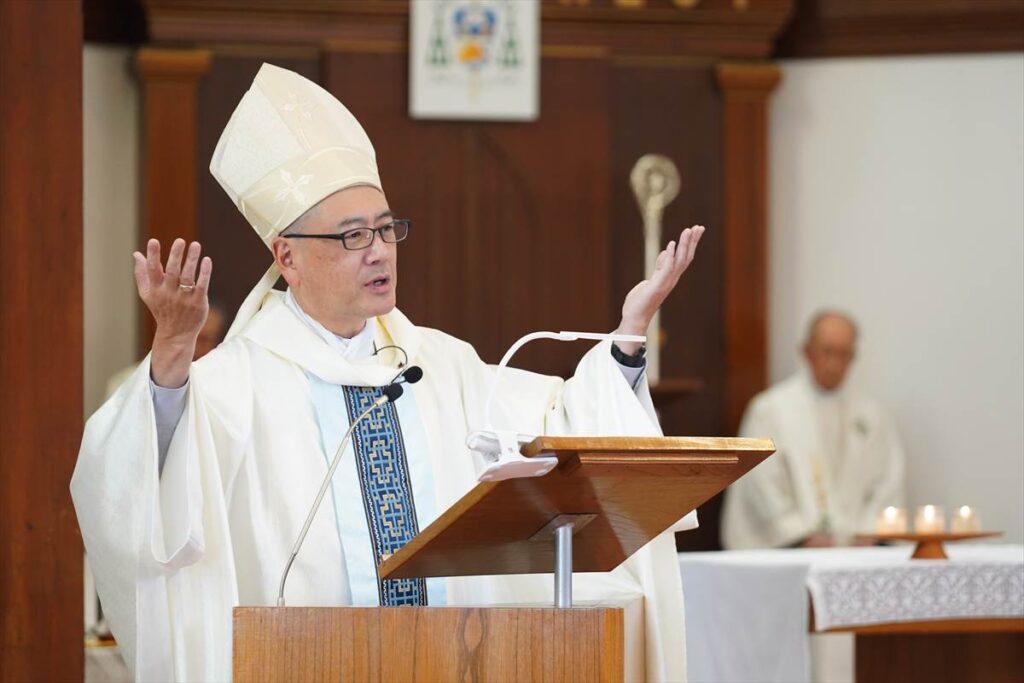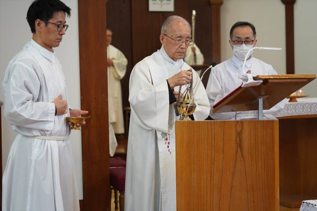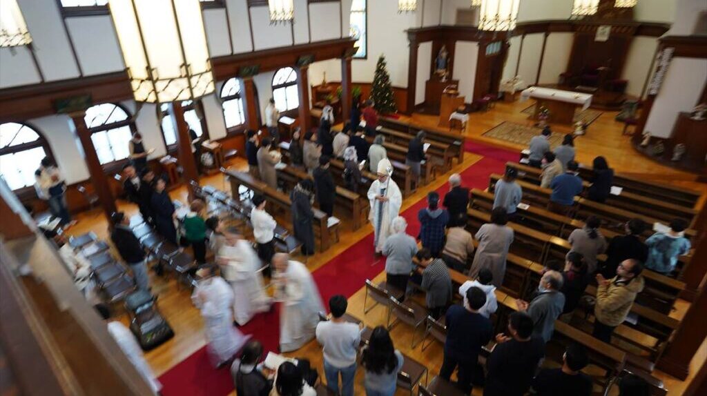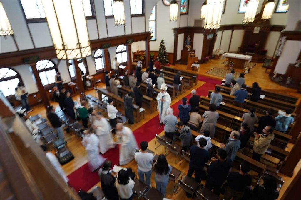 【教会日記】2026年1月1日 神の母聖マリア 元旦の午前0時からは田中神父司式、午前11時からは成井司教、田中神父、町田神父の司式で降誕の8日目、神の母聖マリアのミサが捧げられた。成井司教がいくつかの言語で新年の挨拶を発すると聖堂には和やかな空気が流れた。聖母マリアの生涯に心を向け、改めて世界の平和のために自分が出来ることを考えるよう促された。ミサの終わりに成井司教が年頭司牧書簡を朗読された。ミサ後はセンターにお菓子やお汁粉など美味しいものが沢山用意され、帰省中の懐かしい顔と“お久しぶり!”の挨拶が交わされた。