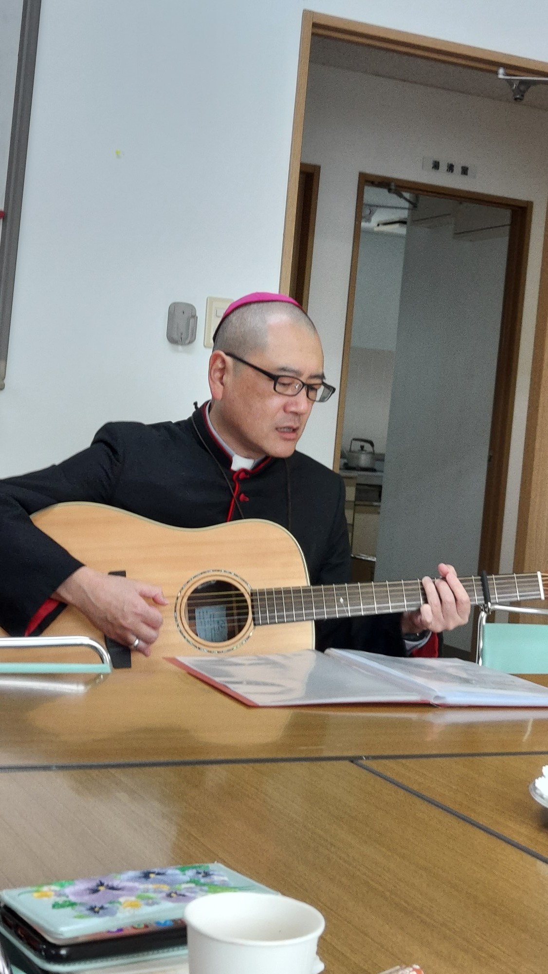 今年の祝賀会はセンターの一階と二階の二つの会場が設けられ、約85人が集まって美味しいカレーライスを食べながら話に興じた。ギターを弾きながらベトナム語で「希望の巡礼者」を、2階から1階へ移動して歌う“流しの司教”に拍手が送られた。