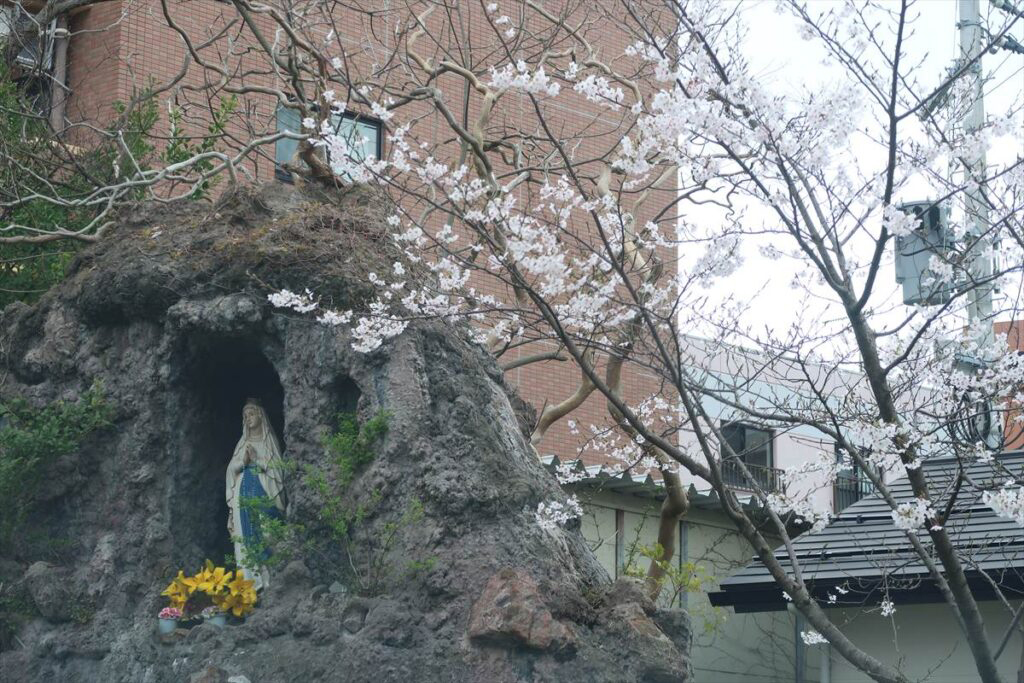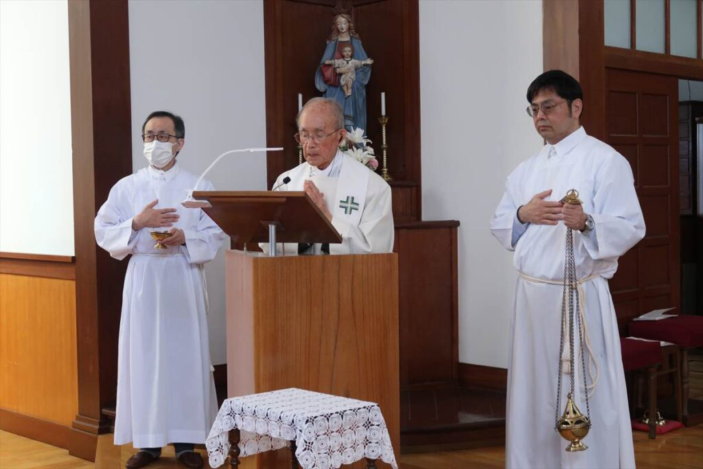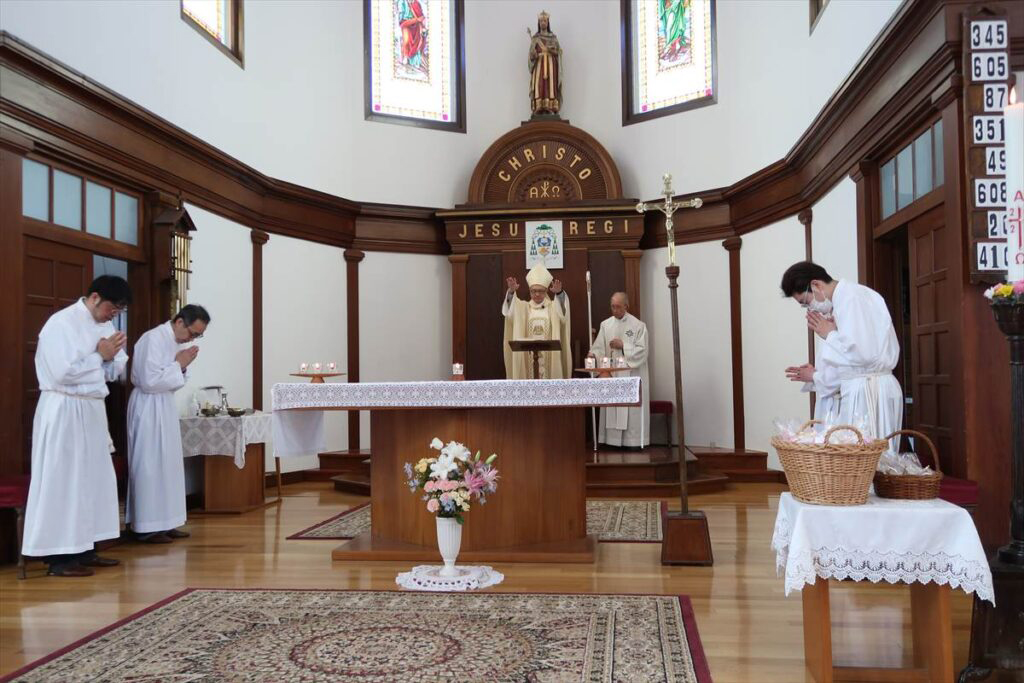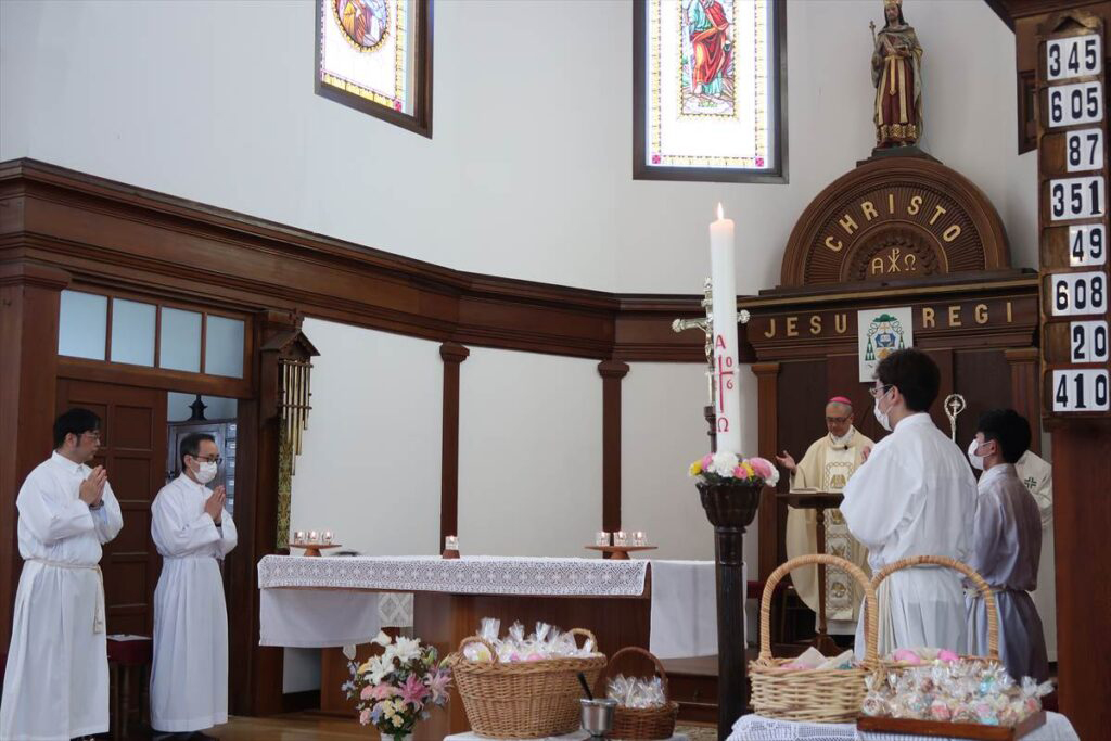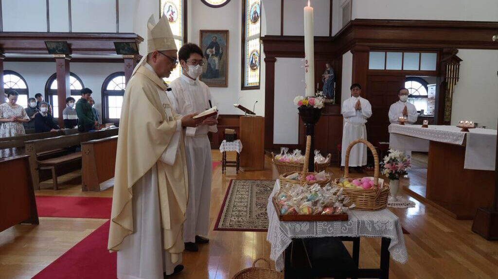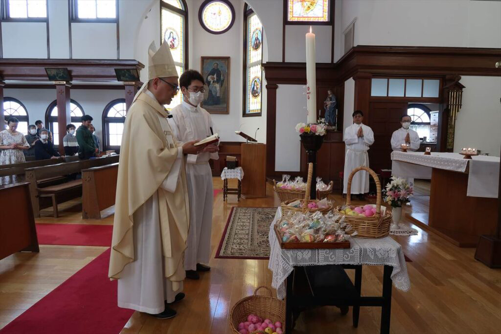 桜が花開いた中迎えた「復活の主日」、聖堂には沢山の人が集まり、成井司教と町田神父の共同司式で日中ミサが行われた。