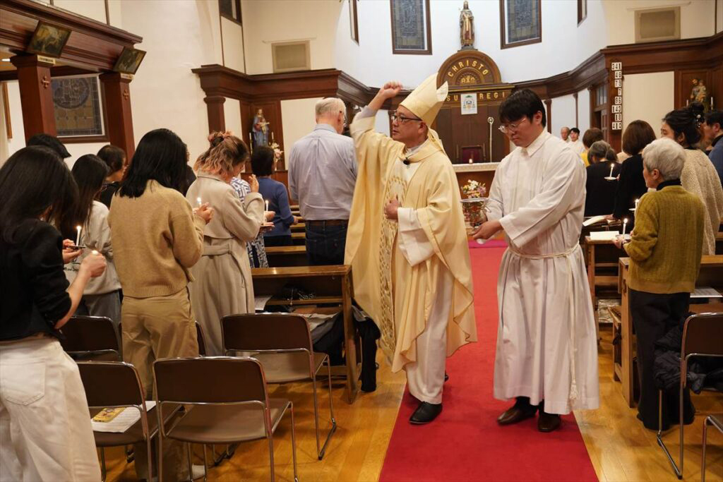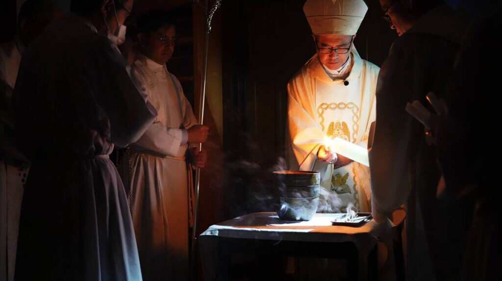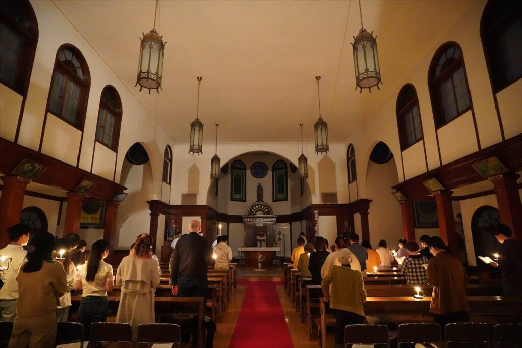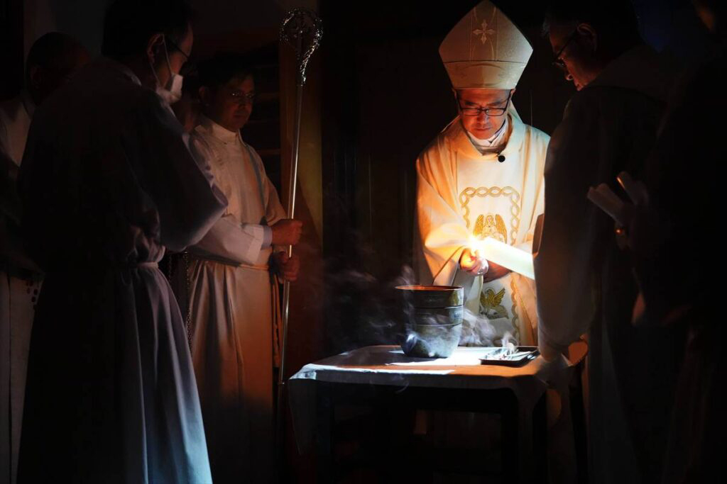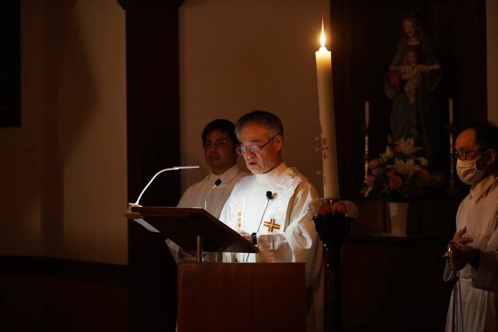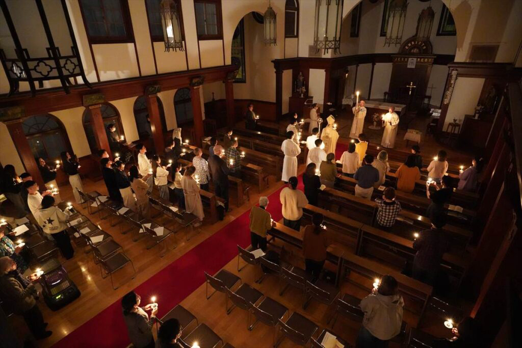 聖堂が暗闇に包まれる中、光の祭儀で復活徹夜祭が始まった。復活ろうそくに新しい火が灯され、司祭の「キリストの光」に応えて会衆は「神に感謝」と歌い祭壇に行列が進んだ。会衆にろうそくの火が広がり、復活賛歌が歌われた。